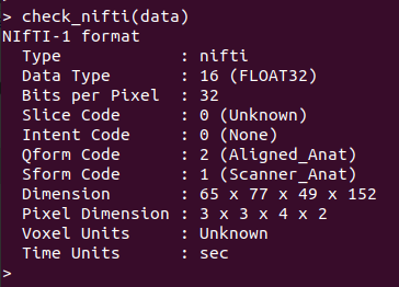 We can use check_nifti function to check the details of the scans. Those information is stored in the “header” of each imaging file. For example, the Pixel Dimension: 3 x 3 x 4 x 2 tells us that the size of each voxel in space is 3 x 3 x 4 mm. The last number is dimension in time: a scan is taken every 2 seconds.